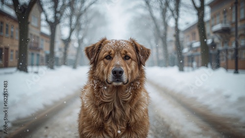 Winter Scene Featuring a Large Stray Dog on a Snow-Laden Path