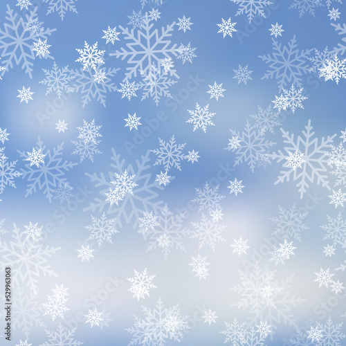 Winter snowfall and snowflakes on light blue background. Xmas and New Year background. Vector