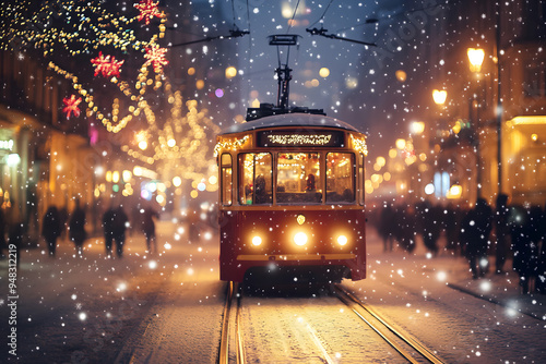 Winter Snowfall, Christmas vintage tram and old street decorated with lights