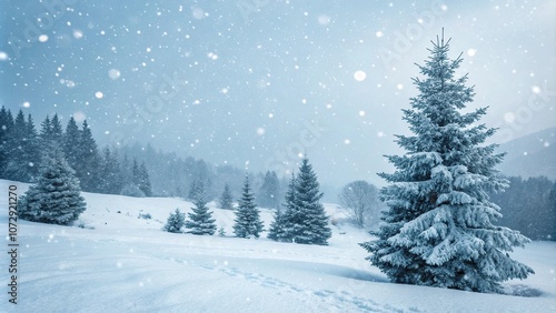 Winter snowflakes gently falling on a serene landscape background with Christmas trees in the distance, cold weather, frosty atmosphere
