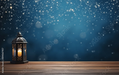 Winter snowy stage background with lantern, wooden floors and Ramadan lights on blue background, banner layout, copy space