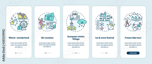 Winter vacation places onboarding mobile app page screen with concepts. Winter wonderland, ski vacation walkthrough 5 steps graphic instructions. UI vector template with RGB color illustrations