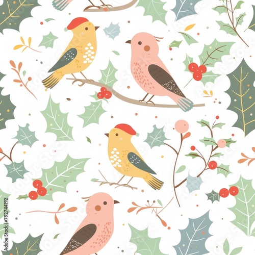 Winter Whimsy: Birds & Holly in Festive Seamless Pattern - Generative AI