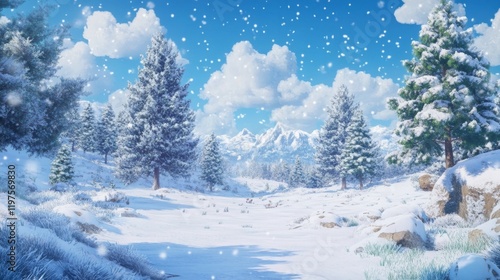 Winter Wonderland Landscape with Snowy Trees and Mountains