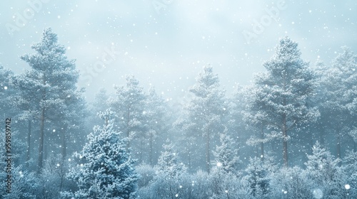Winter Wonderland: Snowfall in a serene pine forest. A tranquil winter scene with snow-covered trees and a soft, dreamy atmosphere.