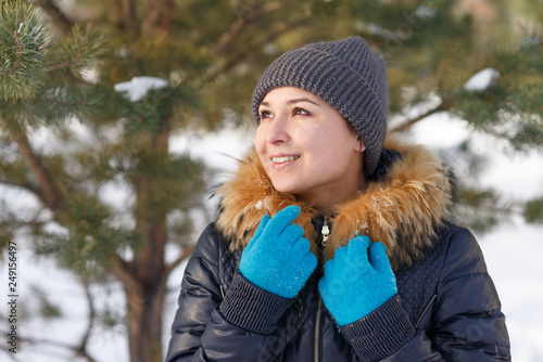 Winter young woman portrait. Beauty Joyful Model Girl laughing and having fun in winter park. Beautiful young female outdoors