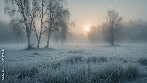 Wintery sunrise over a misty field with icy grass and autumn trees