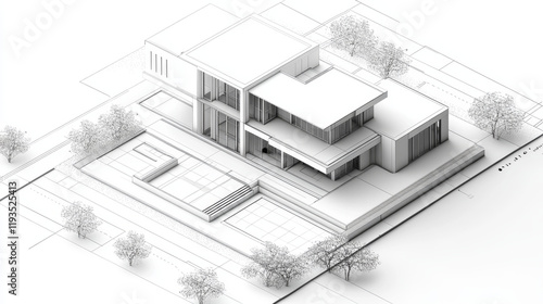 Wireframe blueprint drawing of 3D building. Vector architectural template background.