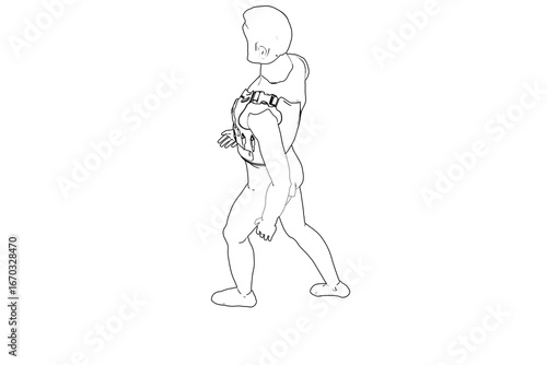Wireframe, Depiction, Technical Drawing, Simple Line Art, Outline Illustration, Monochrome of a walking male figure wearing a chest pack. Ideal for design, engineering, or conceptual visuals.
