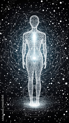 Wireframe human figure stands, surrounded by cosmic network, glowing, for science/technology concepts