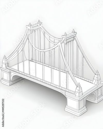 Wireframe model of a suspension bridge with ornate towers and a flat deck