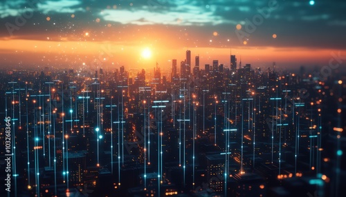 Wireless technology concept with a futuristic cityscape backdrop and data communication lines