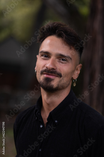 With a gentle smile, a handsome man turns to look at the camera. He has a fresh haircut, trimmed goatee, and delicate earrings. He is standing in front of an enormous, old redwood tree in a park.