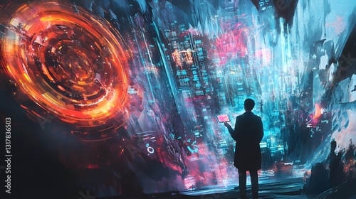 Witnessing the Nexus: A silhouette of a scientist stands before a vibrant, intricate display of data streams, patterns, and swirling energy, creating a portal of technological wonder.