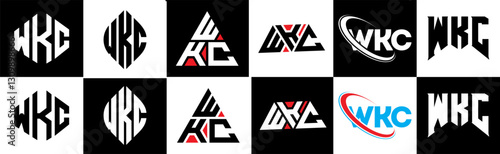 WKC letter logo design in six style. WKC polygon, circle, triangle, hexagon, flat and simple style with black and white color variation letter logo set in one artboard. WKC minimalist and classic logo