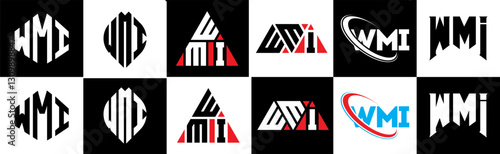 WMI letter logo design in six style. WMI polygon, circle, triangle, hexagon, flat and simple style with black and white color variation letter logo set in one artboard. WMI minimalist and classic logo