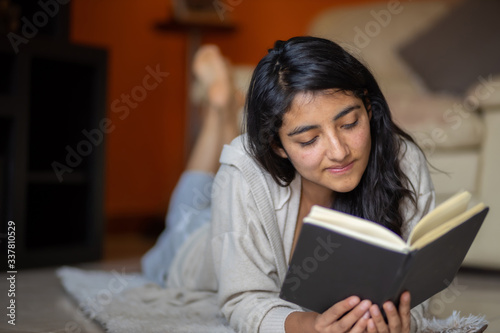 woman lying down looking at the side with a book at home pandemic, coronavirus quarantine in mexico