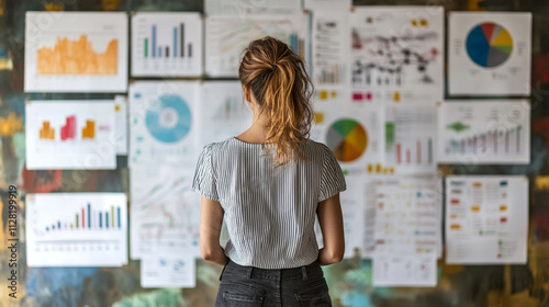 Woman Analyzing Colorful Graphs and Charts on Wall for Business Strategy and Market Research Insights in Modern Office Environment