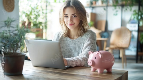 Woman Checking Savings Balance with Laptop and Piggy Bank at Modern Table