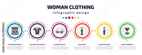 woman clothing infographic element with filled icons and 6 step or option. woman clothing icons such as eyes shades makeup, polo shirt for women, glasses for eyes, long dress, long black gown,