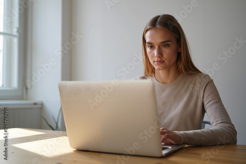 Woman concentrating while working on a laptop at a bright table