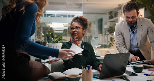 Woman, document and team in office for business, project feedback and review advice at night. Journalist people, paper and tech in agency for article discussion, collaboration and late information