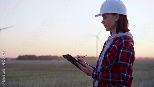 Woman engineer taking notes on a clipboard on a field with wind turbines, as the sun sets. Clean energy and engineering concept