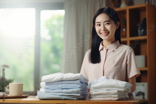Woman Enjoying Morning Routine with Folded Laundry and Coffee in Bright Room