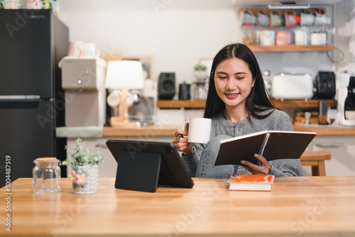 woman enjoys cozy moment at home, sipping coffee while reading notebook and using tablet. warm kitchen setting enhances relaxed atmosphere.