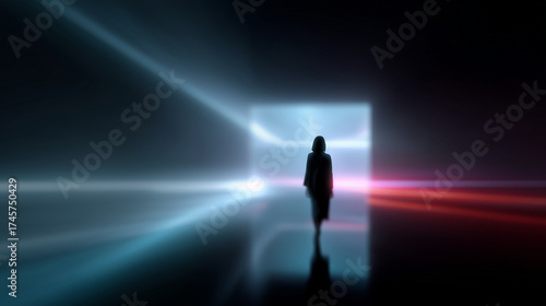 Woman entering a digital portal futuristic cyber world of neon lights and technology future, cyberpunk, neon, digital world, technology, virtual reality, sci-fi, metaverse, data st