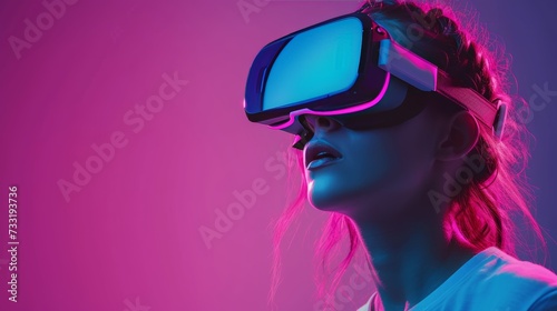 Woman exploring virtual environments through VR glasses, her face reflecting wonder and excitement