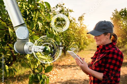 Woman farmer controls robotic arm with a tablet. Smart farming and digital transformation in agriculture