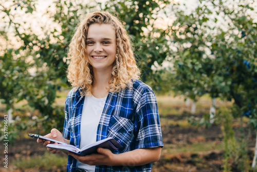 Woman farmer using phone and notepad in farm field. Agriculture concept. Environment research. Business analysis. Green technology. Internet network concept