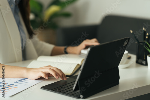 woman hand using laptop, searching web, browsing information, having workplace at home.