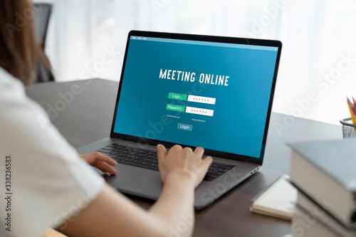 Woman hand using log in to the online meeting website on laptop at house. Concept working from home.