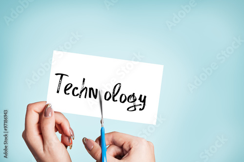 Woman hands cutting card with the word technology