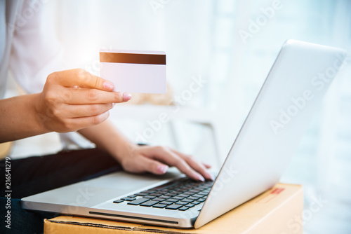 Woman hands holding credit card for online shopping or ordering product from internet when using laptop. Business and Payment concept. E-commerce and internet security concept. Home office and relax