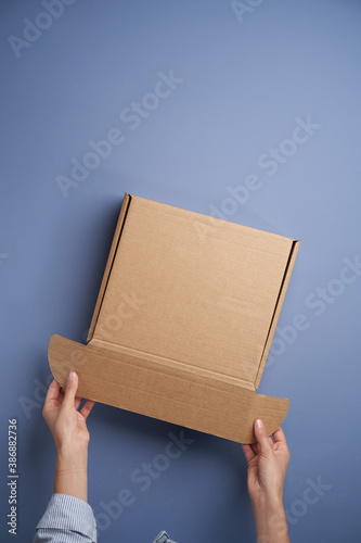 Woman hands open empty cardboard box, top view