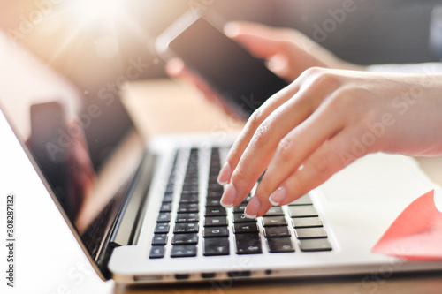 Woman hands typing on modern laptop with white screen top view. Mockup computer workplace and cellphone detail at wooden table.