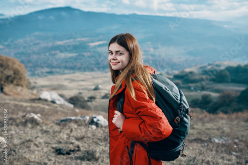 woman hiker in a jacket and with a backpack are resting in the mountains landscape Relax model