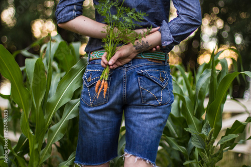 Woman hold a freshly picked bundle of carrots