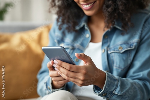 Woman holding a smartphone and smiling while sitting on a sofa indoors.