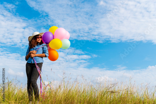 Woman holding balloons running on green meadow white cloud and blue sky with happiness Cheerful and relax. Hands holding vibrant air balloons play on birthday party happy times summer sunlight outdoor
