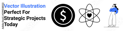 Woman holding her chin beside dollar emblem and atom with heart core, conveying thought, innovation, and balance. Ideal for finance, strategy, technology, science, self-reflection UX design flat