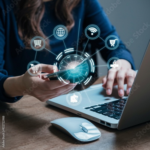 Woman Holding Smartphone with IT Icons: A Modern Technology Concept, Innovative IT Background: Woman with Smartphone Surrounded by Digital Icons, Technology in Action: Woman Holding Smartphone with IT