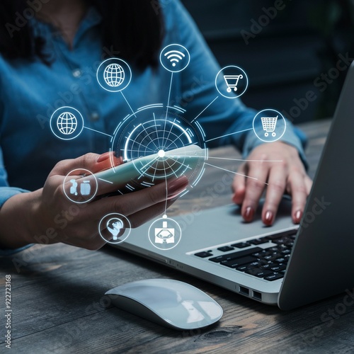 Woman Holding Smartphone with IT Icons: A Modern Technology Concept, Innovative IT Background: Woman with Smartphone Surrounded by Digital Icons, Technology in Action: Woman Holding Smartphone with IT