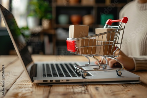 woman holding toy shopping cart with small boxes near laptop, e-commerce concept free space for text