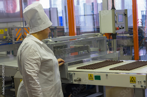 Woman in a confectionery factory is standing near the assembly line with sweets