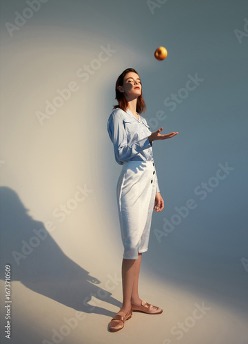 Woman in a light blue dress juggling an orange, conveying a modern and joyful atmosphere.