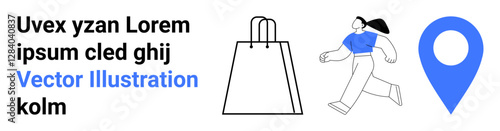 Woman in blue shirt walking near shopping bag and blue location pin alongside placeholder text. Ideal for e-commerce, shopping, direction, travel, digital marketing, retail, landing page